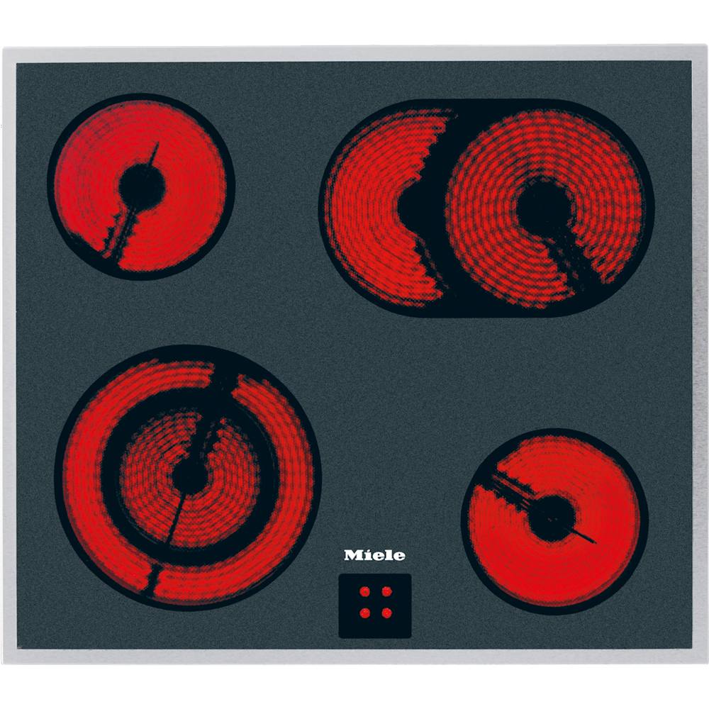 Cerankochfeld mit vier roten Heizplatten. In der Mitte befindet sich das Miele-Logo und eine Bedienfeldanzeige.