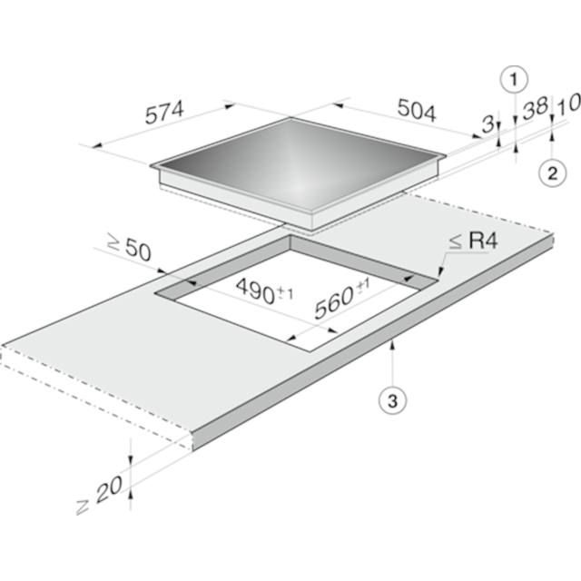 Zeichnung eines Kochfelds mit Maßen. Das Kochfeld ist rechteckig und wird durch Linien mit Maßangaben dargestellt.